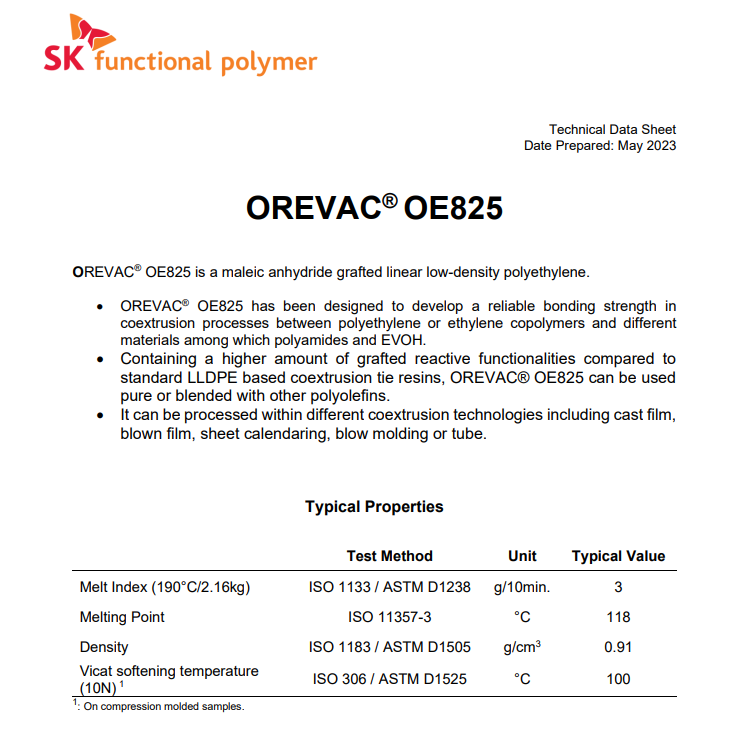 - 法國(guó)阿科瑪 PEPA三層共擠 Orevac OE825 馬來(lái)酸酐改性粘合劑樹(shù)脂 物性表, 法國(guó)阿科瑪 PEPA三層共擠 Orevac OE825 馬來(lái)酸酐改性粘合劑樹(shù)脂 產(chǎn)品參數(shù),法國(guó)阿科瑪 PEPA三層共擠 Orevac OE825 馬來(lái)酸酐改性粘合劑樹(shù)脂 性能表,法國(guó)阿科瑪 PEPA三層共擠 Orevac OE825 馬來(lái)酸酐改性粘合劑樹(shù)脂 出廠報(bào)告, MSDS,, 物質(zhì)安全資料表, UL黃卡,{ SGS報(bào)告, RoHS, 食品級(jí)認(rèn)證, NSF飲用水標(biāo)準(zhǔn), 產(chǎn)品資料, 產(chǎn)品性能, 出廠報(bào)告, 原廠原包, 代理商, 熱變形溫度, 熔指數(shù), 流動(dòng)系數(shù), 抗沖擊性能、沖擊強(qiáng)度, 低溫韌性、低溫抗沖擊性能, 熔體流動(dòng)系數(shù)、熔體流動(dòng)速率, 加工工藝、加工參數(shù)、加工溫度, 歐盟RoHS 德國(guó)FDA 美國(guó)FDA 日本FDA