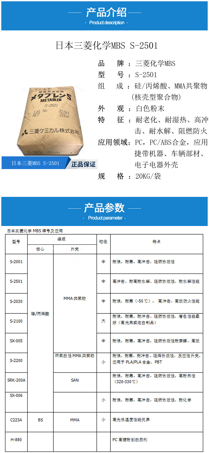 - 三菱麗陽增韌劑S2501 耐高溫耐水解 阻燃效應 高沖擊 日本S-2501 物性表, 三菱麗陽增韌劑S2501 耐高溫耐水解 阻燃效應 高沖擊 日本S-2501 產(chǎn)品參數(shù),三菱麗陽增韌劑S2501 耐高溫耐水解 阻燃效應 高沖擊 日本S-2501 性能表,三菱麗陽增韌劑S2501 耐高溫耐水解 阻燃效應 高沖擊 日本S-2501 出廠報告, MSDS,, 物質(zhì)安全資料表, UL黃卡,{ SGS報告, RoHS, 食品級認證, NSF飲用水標準, 產(chǎn)品資料, 產(chǎn)品性能, 出廠報告, 原廠原包, 代理商, 熱變形溫度, 熔指數(shù), 流動系數(shù), 抗沖擊性能、沖擊強度, 低溫韌性、低溫抗沖擊性能, 熔體流動系數(shù)、熔體流動速率, 加工工藝、加工參數(shù)、加工溫度, 歐盟RoHS 德國FDA 美國FDA 日本FDA