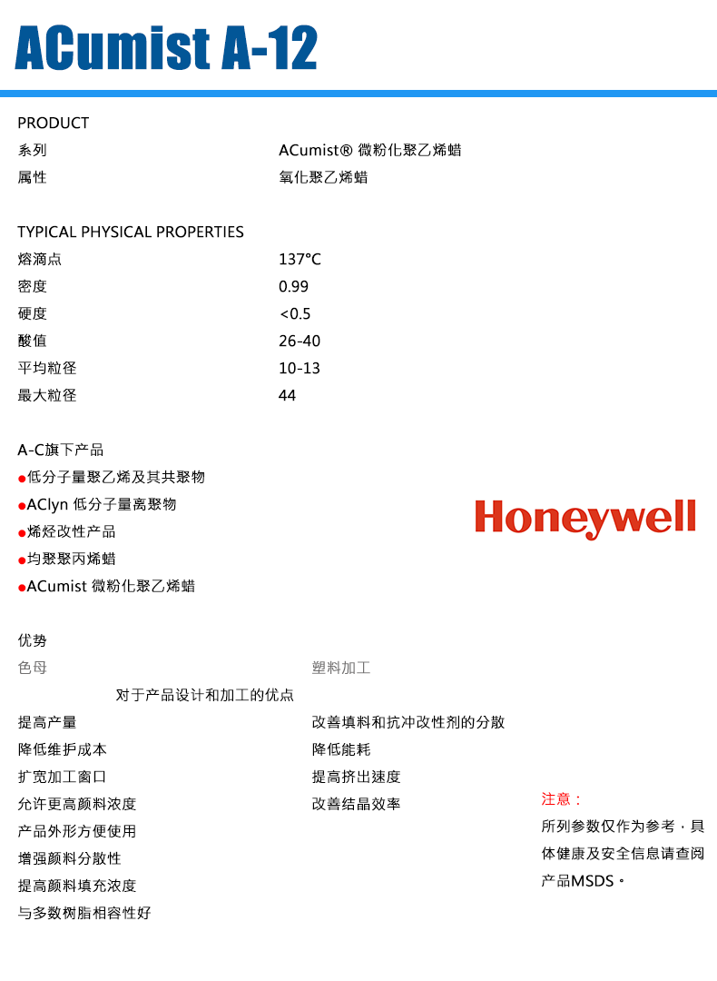 • 霍尼韋爾蠟粉 ACumist A-12 原裝進口 物性表, 霍尼韋爾蠟粉 ACumist A-12 原裝進口 產品參數,霍尼韋爾蠟粉 ACumist A-12 原裝進口 性能表,霍尼韋爾蠟粉 ACumist A-12 原裝進口 出廠報告, MSDS,, 物質安全資料表, UL黃卡,{ SGS報告, RoHS, 食品級認證, NSF飲用水標準, 產品資料, 產品性能, 出廠報告, 原廠原包, 代理商, 熱變形溫度, 熔指數, 流動系數, 抗沖擊性能、沖擊強度, 低溫韌性、低溫抗沖擊性能, 熔體流動系數、熔體流動速率, 加工工藝、加工參數、加工溫度, 歐盟RoHS 德國FDA 美國FDA 日本FDA