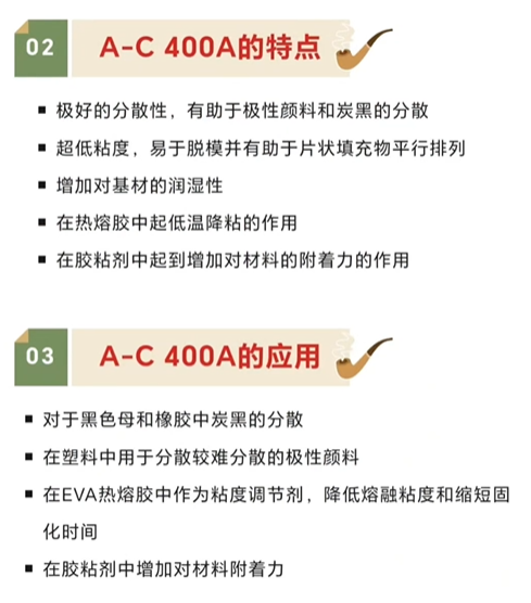 A-C 400A是一種乙烯-醋酸乙烯共聚物蠟,***適合用在需要分散碳黑的黑色母、難分散顏料的色母以及EVA色母中。