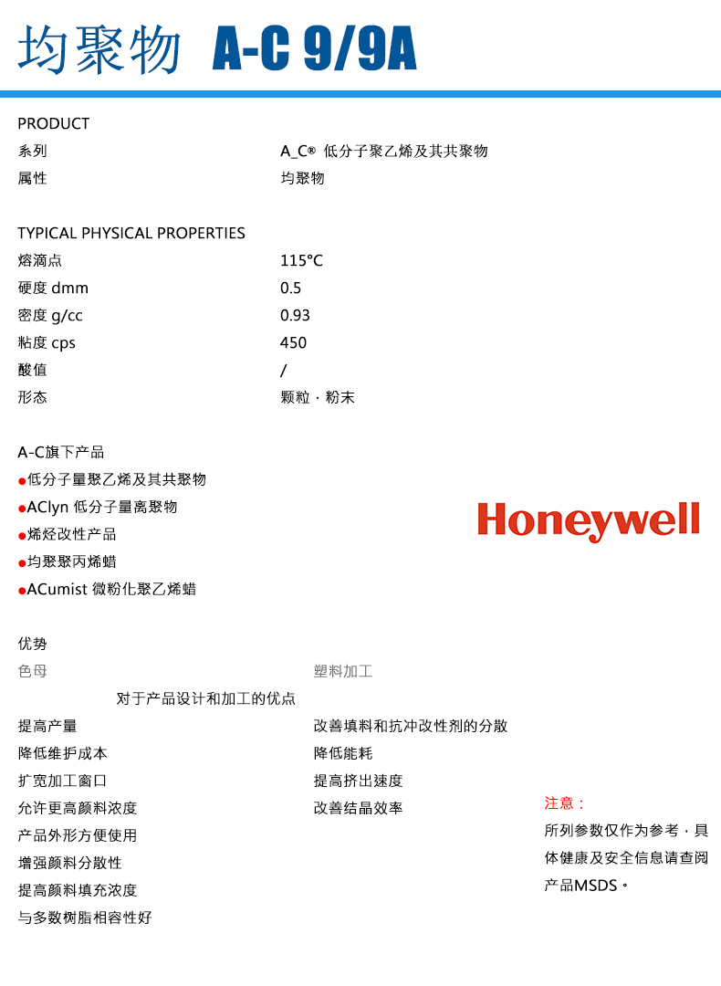 - 霍尼韋爾 A-C® 9A 低密度聚乙烯 (LDPE) 均聚物 物性表, 霍尼韋爾 A-C® 9A 低密度聚乙烯 (LDPE) 均聚物 產品參數,霍尼韋爾 A-C® 9A 低密度聚乙烯 (LDPE) 均聚物 性能表,霍尼韋爾 A-C® 9A 低密度聚乙烯 (LDPE) 均聚物 出廠報告, MSDS,, 物質安全資料表, UL黃卡,{ SGS報告, RoHS, 食品級認證, NSF飲用水標準, 產品資料, 產品性能, 出廠報告, 原廠原包, 代理商, 熱變形溫度, 熔指數, 流動系數, 抗沖擊性能、沖擊強度, 低溫韌性、低溫抗沖擊性能, 熔體流動系數、熔體流動速率, 加工工藝、加工參數、加工溫度, 歐盟RoHS 德國FDA 美國FDA 日本FDA