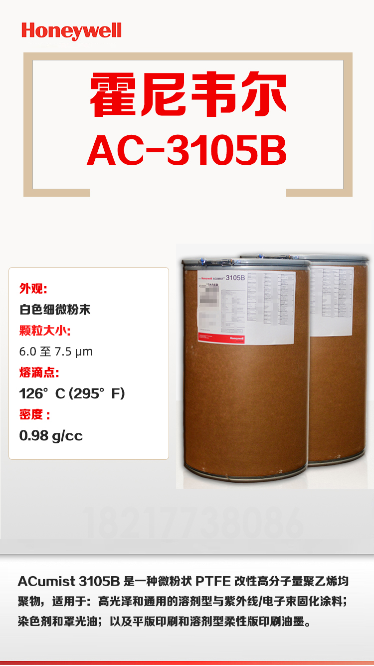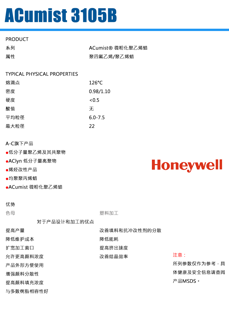 - 美國霍尼韋爾ACumist 3105B 聚四氟乙烯聚乙烯混合蠟粉 物性表, 美國霍尼韋爾ACumist 3105B 聚四氟乙烯聚乙烯混合蠟粉 產(chǎn)品參數(shù),美國霍尼韋爾ACumist 3105B 聚四氟乙烯聚乙烯混合蠟粉 性能表,美國霍尼韋爾ACumist 3105B 聚四氟乙烯聚乙烯混合蠟粉 出廠報告, MSDS,, 物質安全資料表, UL黃卡,{ SGS報告, RoHS, 食品級認證, NSF飲用水標準, 產(chǎn)品資料, 產(chǎn)品性能, 出廠報告, 原廠原包, 代理商, 熱變形溫度, 熔指數(shù), 流動系數(shù), 抗沖擊性能、沖擊強度, 低溫韌性、低溫抗沖擊性能, 熔體流動系數(shù)、熔體流動速率, 加工工藝、加工參數(shù)、加工溫度, 歐盟RoHS 德國FDA 美國FDA 日本FDA