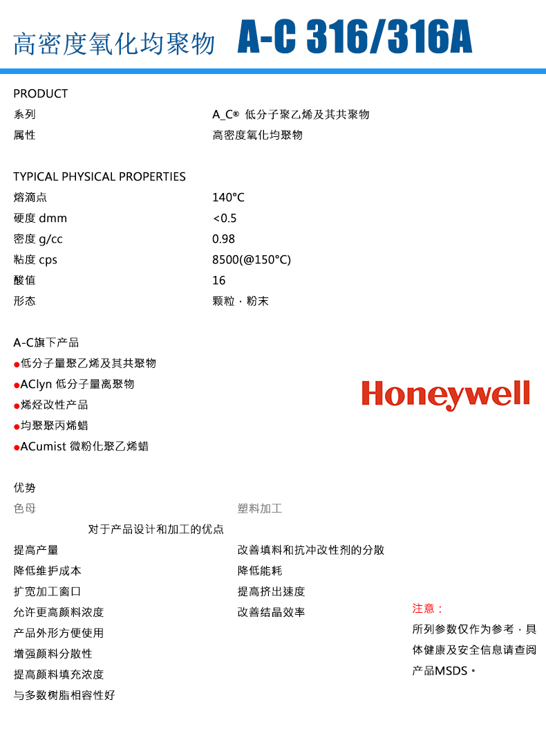 - 霍尼韋爾 Honeywell AC 316A 氧化高密度聚乙烯蠟 物性表, 霍尼韋爾 Honeywell AC 316A 氧化高密度聚乙烯蠟 產品參數,霍尼韋爾 Honeywell AC 316A 氧化高密度聚乙烯蠟 性能表,霍尼韋爾 Honeywell AC 316A 氧化高密度聚乙烯蠟 出廠報告, MSDS,, 物質安全資料表, UL黃卡,{ SGS報告, RoHS, 食品級認證, NSF飲用水標準, 產品資料, 產品性能, 出廠報告, 原廠原包, 代理商, 熱變形溫度, 熔指數, 流動系數, 抗沖擊性能、沖擊強度, 低溫韌性、低溫抗沖擊性能, 熔體流動系數、熔體流動速率, 加工工藝、加工參數、加工溫度, 歐盟RoHS 德國FDA 美國FDA 日本FDA